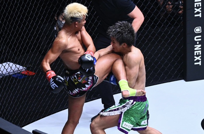 3R、スーパーレックが足を上げると、与座はその足に自分の足を絡めてスーパーレックを転倒させる。与座の左ローにスーパーレックは飛びヒザ蹴り、与座の左ローにスーパーレックが転倒。与座が入り込んでローを蹴るとスーパーレックは右ミドル。与座は抱えて倒してしまい、注意を受ける。
