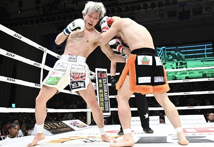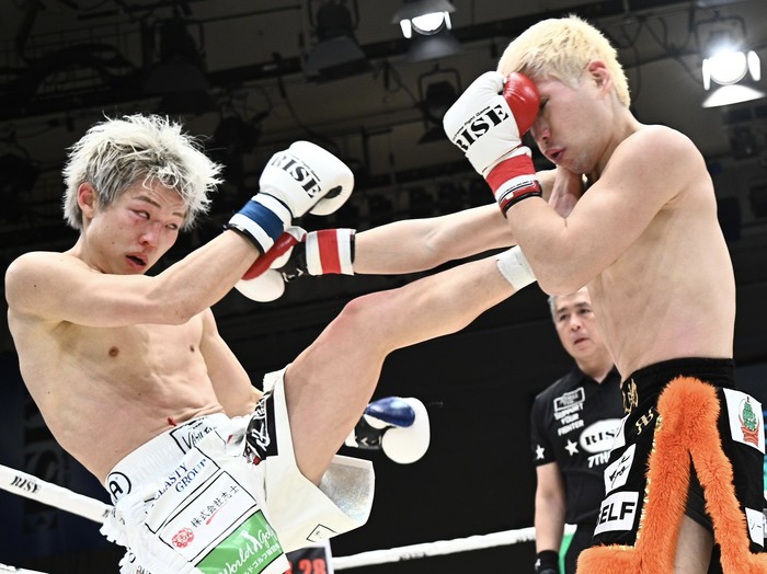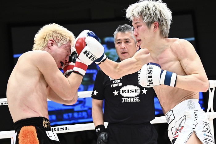 有井の左三日月に松下は左右フック。打ち合いになると松下が左フックを当て、右カーフと左三日月も命中させる。それでも松下は前へ出てのワンツー連打、右カーフ。松下は左右ボディで応戦。松下が左右フックと右カーフ、ロープを背にした有井は左フックを打ち返す。