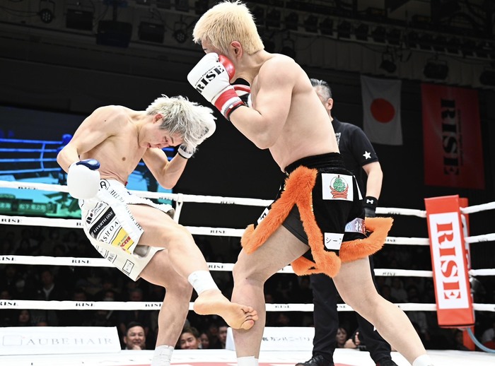 3R開始と同時に右目下が腫れた松下にドクターチェック。再開後、有井は前へ出てくる松下を前蹴りで押し返す。打ち合いを仕掛けてくる松下に有井も打ち合い、松下のワンツー、有井の左フックがヒット。